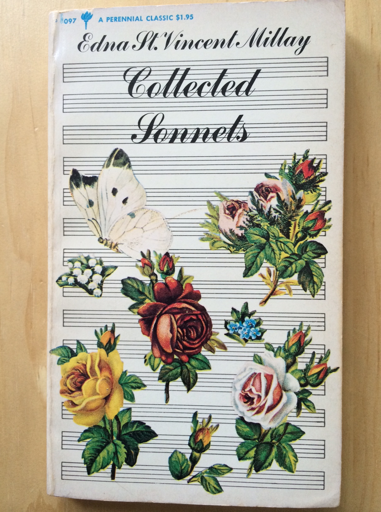 As you can see from the picture above, one of the books I picked up at Harvard Bookstore was this vintage (that cover!) Harper Perennial pocket edition of Edna St. Vincent Millay’s Collected Sonnets (chosen by the poet herself, apparently). I love the look and the weight of the volume.